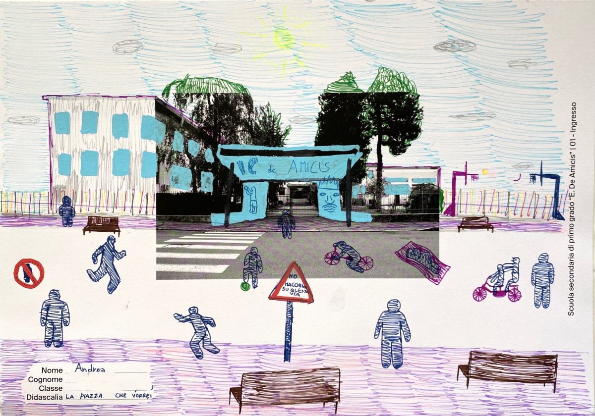 - una raccolta di idee, senza limiti alla creatività, mediante lo strumento del disegno sugli scatti fotografici precedentemente realizzati, attraverso cui immaginare la propria piazza scolastica del futuro